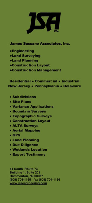 James Sassano Associates, Inc. has been a trusted partner with Home Builders, Developers, Contractors, Architects, and Municipalities since 1996. Services provided by JSA include Major and Minor Subdivisions, Site Plans, Stormwater Management, Boundary, Topographic and ALTA Surveys, GPS and Robotic Surveying, Construction Layout and Management, Expert Testimony and Due Diligence. We are licensed to provide service in New Jersey, Pennsylvania and Delaware.
